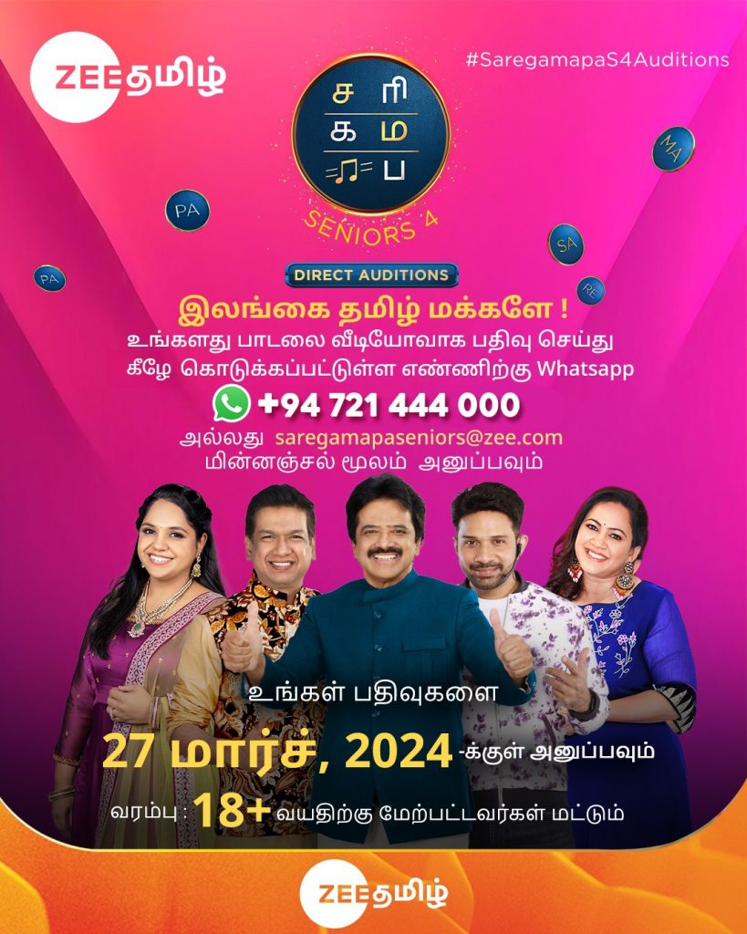 We will integrate with Zee Tamil’s SAREGAMAPA Season 04 – “Seniors Singing Audition” Now in Sri lanka,,